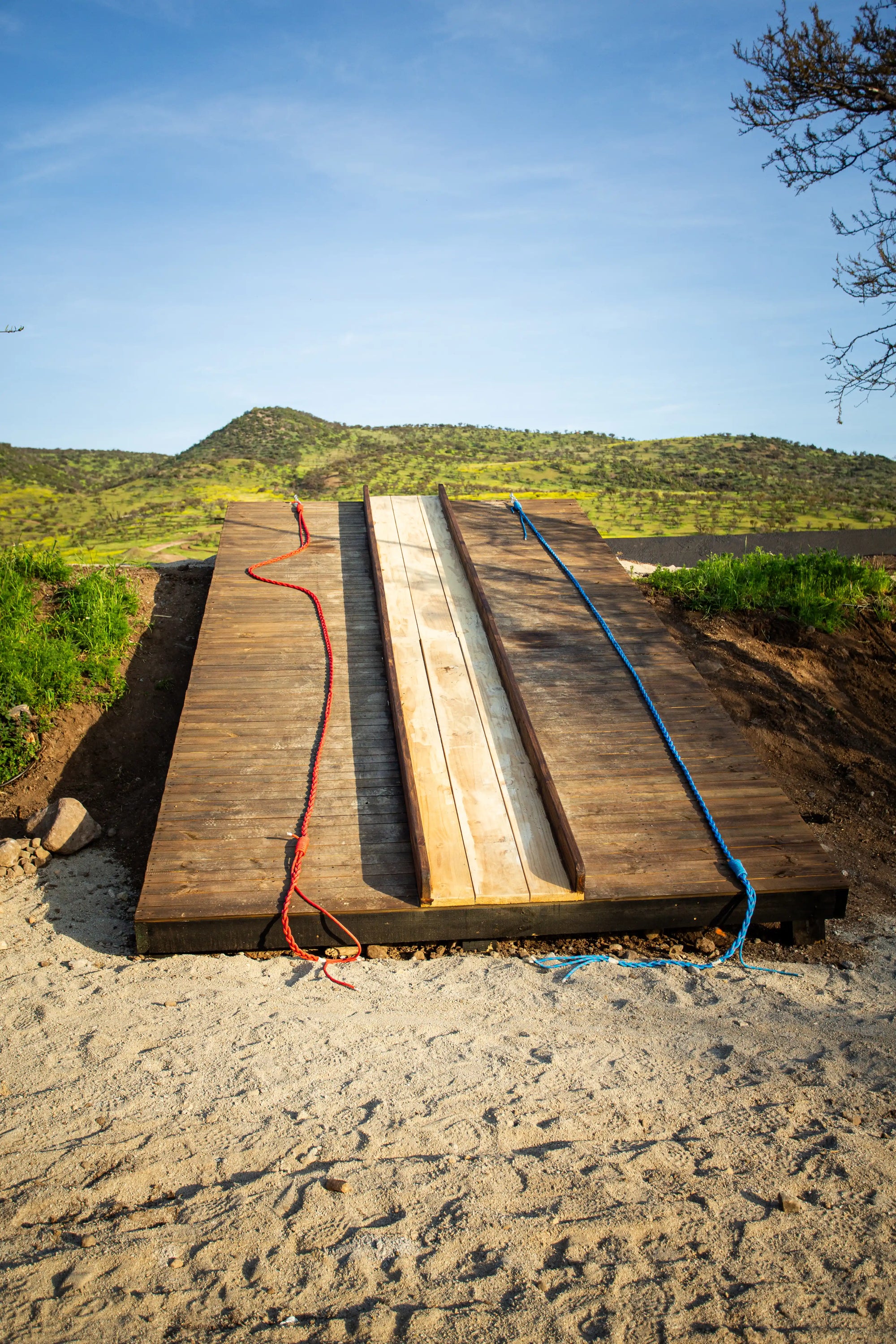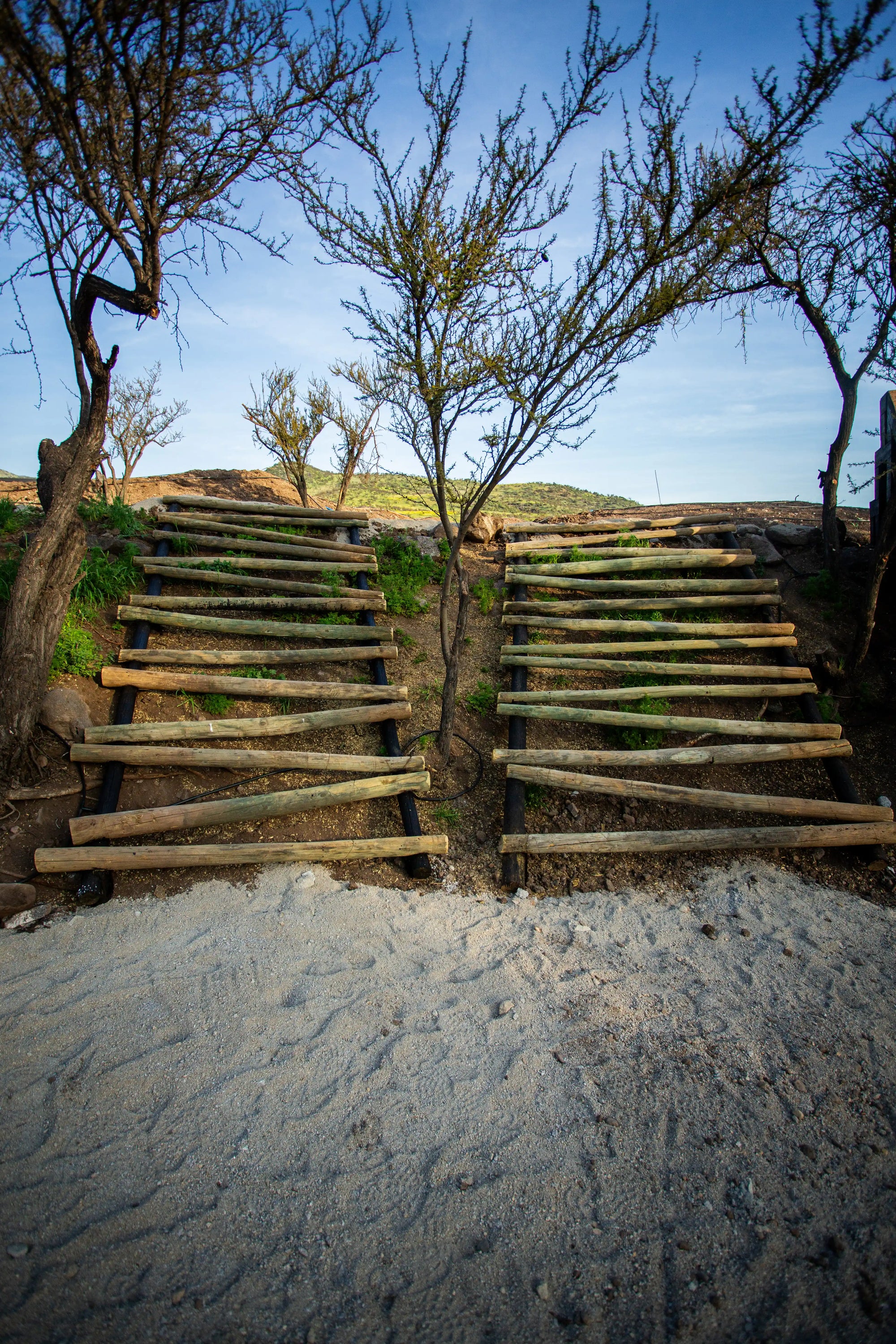 Un obstáculo dinámico para poder subir y bajar de la pendiente entre peldaños de madera dispuestos de manera aleatoria.