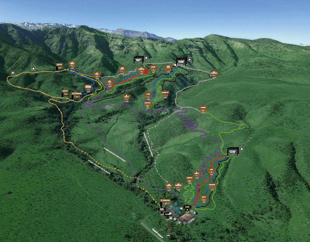 Más de 18 pistas de mountainbike, 3 subidas y muchos saltos, piedras, raíces y peraltes te esperan para que los disfrutes de inicio a fin.